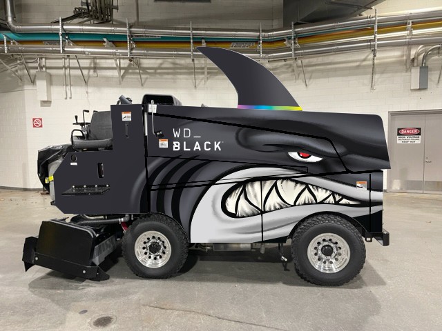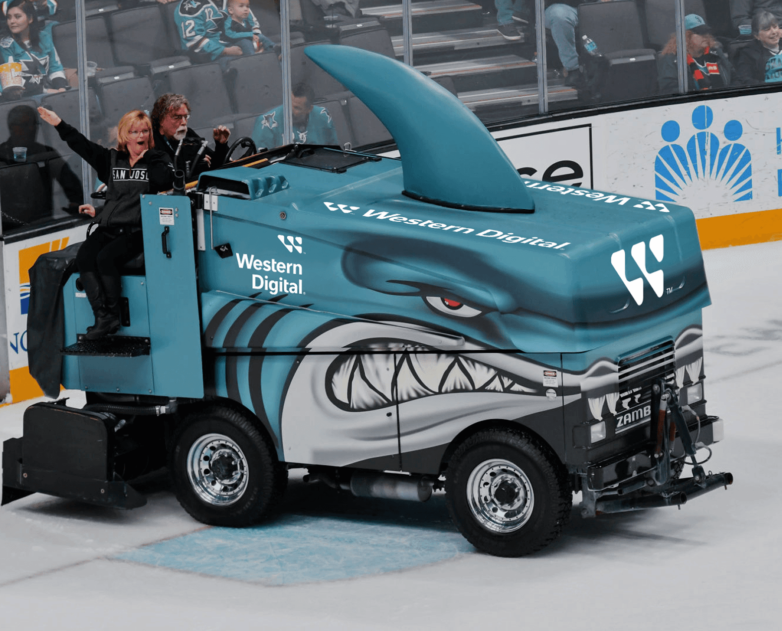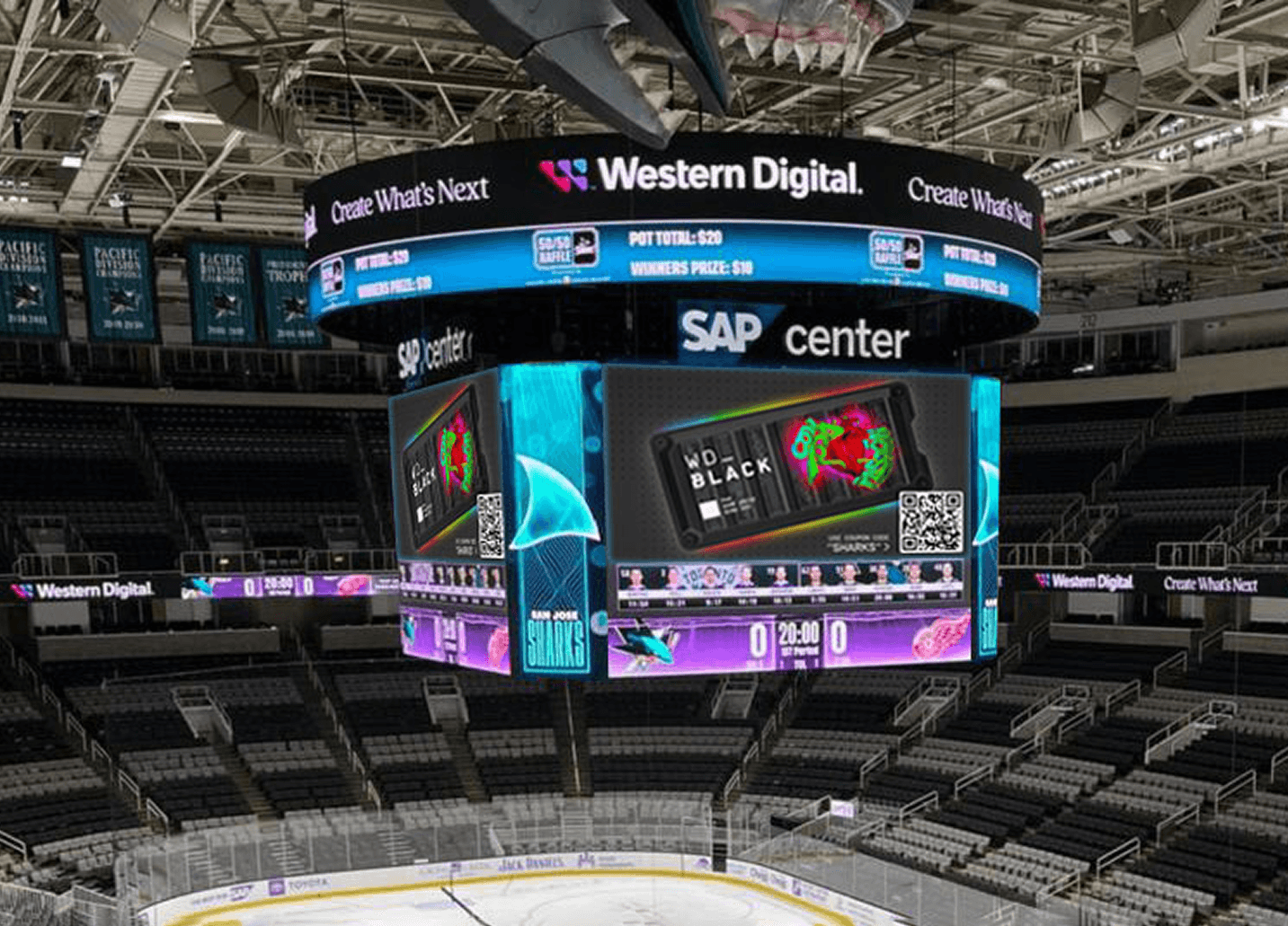 Created branded assets for the San Jose Sharks SAP Center, including Zamboni graphics, stadium scoreboard, fascia and other digital signage.